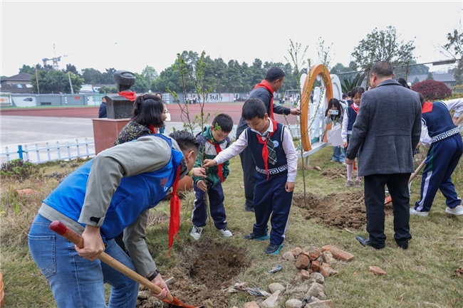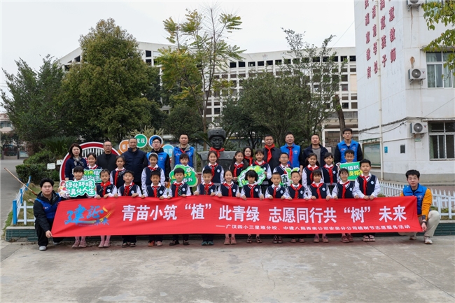 挖坑、扶苗、培土、浇水……3月12日植树节当天,四川省广汉四小三星堆分校的校园里一派热火朝天的劳动景象。中建八局西南公司安装分公司“青苗小筑”志愿服务队的青年志愿者们走进校园,与该校学生代表结对子,共同种下30余棵寓意“桃李满天下”的李子树苗,用汗水为校园增添一抹新绿。