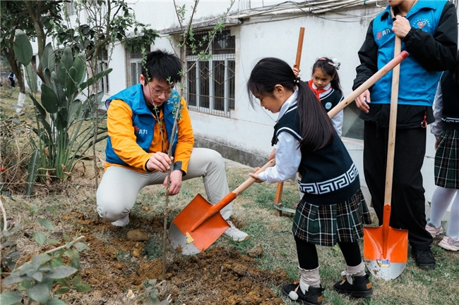 下午时分,简短的启动仪式后,志愿者们和孩子们便迫不及待地拿起铁锹、水桶奔向种植区域。“来,小朋友,咱们一起把树苗扶正,我来填土。”在劳动基地旁,青年志愿者半蹲在地上,手把手地教孩子们如何握锹、如何培土。孩子们虽力气不大,却个个干劲十足——挥锹填土、提水浇灌,小心翼翼地将写有班级姓名的“认养牌”挂在树苗上。阳光下,一双双沾满泥土的小手和一张张红扑扑的笑脸,成为春天最生动的画面。
